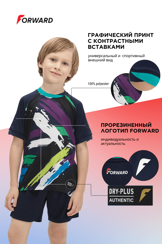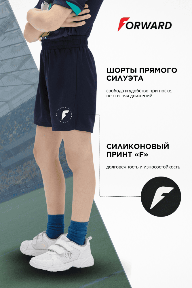 Теперь поговорим про то, что часто расстраивает родителей: красивые надписи и логотипы, которые слезают после третьей стирки. Дети растут быстро, и форму приходится менять часто, но обидно, когда она теряет вид уже через месяц. В моделях FORWARD используется два вида нанесения, и оба – надежные. Первый – силиконовые принты. На шортах это логотип «F», на футболке – такие же принты «F» и «DRY PLUS AUTHENTIC». Силиконовые принты объемные, мягкие на ощупь и главное – эластичные. Они тянутся вместе с тканью, поэтому не трескаются при растяжении и не отваливаются кусками после стирки.