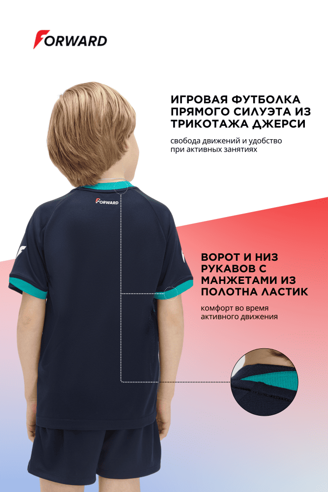 Допустим, с тканью разобрались. Идем дальше. Следующий важный момент – как форма сидит на фигуре. В футболе важно, чтобы ничего не натирало, не сковывало и не болталось. Возвращаемся к той же футболке FORWARD. У нее прямой силуэт – это золотая середина: не обтягивает, но и не висит мешком. Такая посадка оставляет немного воздуха между телом и тканью, что помогает не перегреваться. Но главная фишка здесь – рукава. Обратите внимание: они сшиты не как обычно, а целиком, одним куском от шеи до запястья. В спорте это называется покрой реглан. Смысл простой: когда ребенок машет руками во время бега, такой рукав нигде не тянет и не натирает. Плечи свободны, ничего не мешает.